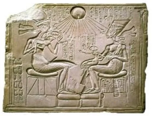 Figura 3: Akhenaton e sua esposa Nefertiti adorando o disco solar de Aton, imagem registra afeto entre a família. Disponível em: