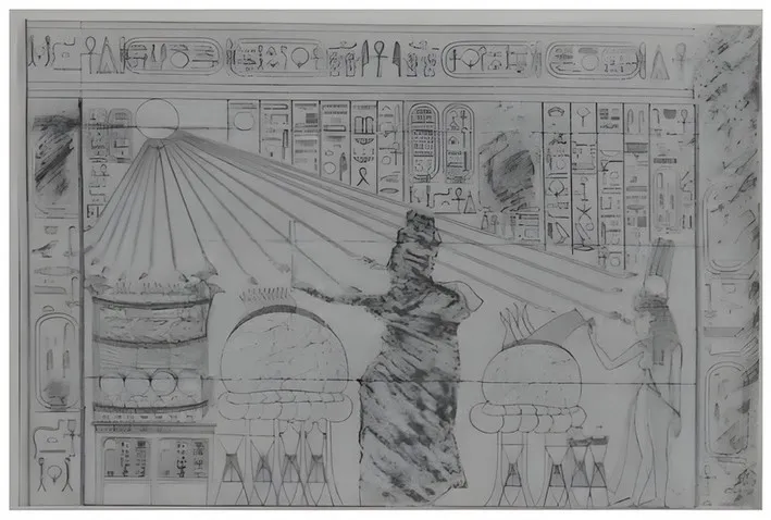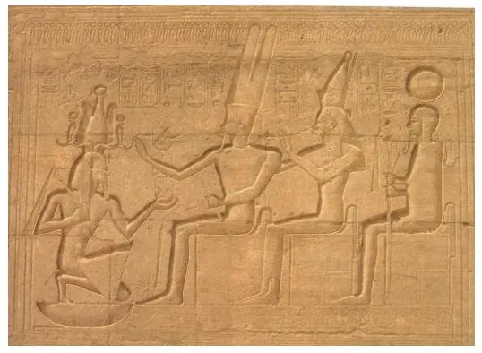 Figura 7: O painel mostra a figura apagada do rei herege Akhenaton adorando o Disco Solar, seguido por sua mãe, a Rainha Tiy, para quem o santuário foi feito.